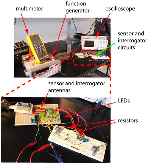 Figure 4 shows the photos of the experimental setup of the circuit with four LEDs and resistors that is equivalent to the circuit that will be used in the proposed corrosion sensor. The resistors in the circuit represent the sensing strips with different thicknesses. Green (3 mm) diffused LED lamps were used in the experimental setup. The transmitter (reader) and sensor (tag) antennas were mounted directly opposite to each other at a 2 mm distance using a height gage. Excitation voltage signal was generated by a function generator and the signals across each LED in the sensor circuit were logged using an oscilloscope.