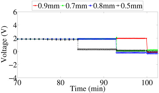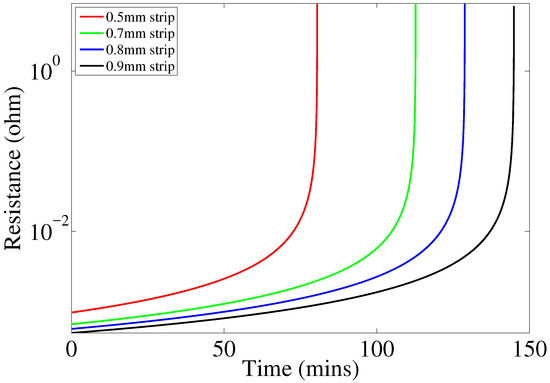 The same procedure was repeated for other circuit branches representing the 0.7 mm, 0.8 mm and 0.9 mm strips using the same variable resistor to ensure consistency. The resistance value at which the LED fails to emit light was recorded and is shown in Table 1. Using Equation (16), one can also estimate the time necessary to reach the simulated failure resistance values. The obtained values are also shown in Table 1.