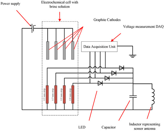 Throughout the experiment, the metal strips were connected to the sensor circuit, which was energized wirelessly by the interrogator circuit. The distance between the interrogator and sensor antennas was fixed at 2 mm throughout the experiment using a height gauge. The current passing through each of the strips and the voltage across each LED in the sensor circuit was monitored using a data acquisition module connected to a PC with LabVIEW software (LabVIEW 2013, National Instruments Corporation, Austin, TX, USA). Figure 9 shows a schematic diagram describing the connections made for the four strips used in the experiment. The fixture assembly with the sensing strips was positioned in parallel and at equal distances to the graphite cathodes.