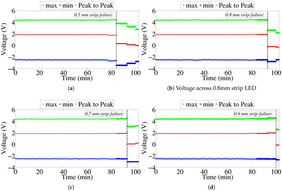 Maximum, minimum and peak-to-peak voltages across different strip LEDs. (a) voltage across 0.5 mm strip LED; (b) voltage across 0.8 mm strip LED; (c) voltage across 0.7 mm strip LED; (d) voltage across 0.9 mm strip LED.