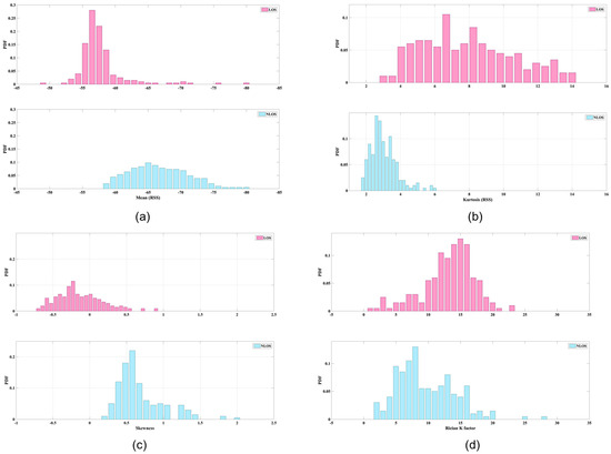 Figure 2. The feature demonstrations of the LOS/NLOS signal, (a) mean value; (b) Kurtosis value; (c) Skewness value; (d) Rician K factor. - Kurtosis () is used to measure the sharpness of the peak of the probability distribution. The measurements of RSS in LOS conditions are more centralized than those derived from NLOS conditions, because the dominant LOS signal has a stronger energy presentation. Figure 2b shows an example of the kurtosis data. Because of the representation of numbers at the peaks of probability distributions, the figure is based on the number of samples. If fewer samples had been collected, it would be difficult to ascertain the different conditions.