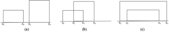 The example of interval relations is shown in Figure 3, including exclusion, overlapping and inclusion cases. Let A = [ and B = [ be independent intervals and , be random values distributed on these intervals. Accordingly, Dymova et al. defined four mutually exclusive events , i = 1 to 4, may take place in considered situation in Figure 3 [26]. In the exclusion case, the event is depicted as follows: