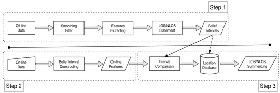 Figure 4 depicts the proposed system structure. First, in the offline phase, the system gathers advanced RSS offline data, and the features of LOS and NLOS data are extracted during this phase. Accordingly, in the online phase, when a user stands in a fixed position, the system collects the online RSS value and extracts the online features. Finally, the proposed mass function is applied and compared for the LOS and NLOS conditions.