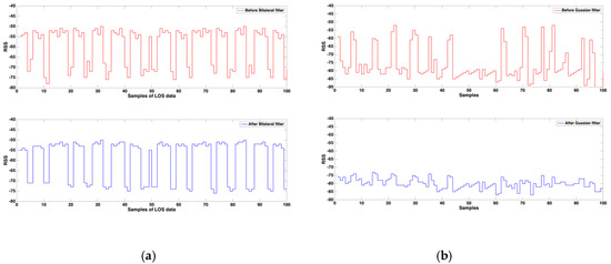 Regarding LOS signatures, the performance of data transmission is straightforward; data cluster together. Most RSS histograms could be fitted very accurately with a Gaussian distribution. Thus, in a series of time domain RSS data, the maximum and minimum strength values of power can be ignored. In our study, the proposed system applies a bilateral filter on the RSS in the LOS condition. The domain filter is a traditional filtering method; it enforces closeness by weighing pixel values with coefficients that become smaller with longer distances. Similarly, the range filter averages image values with weights that decay with dissimilarity. Hence, to combine the domain and range filters, the bilateral filter can detect the geometric looseness and photometric similarity, and can prefer near values to distant values in both domain and range [27]. The equation of the bilateral filter is listed as follows; is represented as the predicated location surrounded by the |S| signals: