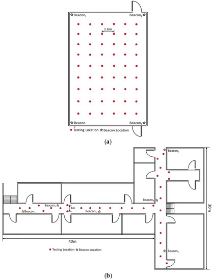 In this section, we report on experiments conducted in two physical environments. One was the area on the third floor of the 55th building of Tianjin University, which had four beacons deployed on the corners of a square area that was 30 m × 30 m (Figure 6a). This area was divided into 54 blocks for signal detection. The testing locations are marked by red dots in Figure 6. The other field experiment was performed in the same building but on the second floor. The second location had two corridors that were 40 and 30 m in length (Figure 6b). The signal detecting points were equally distributed at 1-m intervals along the corridors. The area was a typical building hall with some pillars at each corner of the area. The center of the area was relatively open and people were able to walk around freely. Six Bluetooth transmitters were placed in the corners of the area to ensure full signal coverage of the testing area. Each Bluetooth transmitter was designed to transmit 100 signals per second, and the handheld system used in this study collected 800–1000 RSS samples in each location.