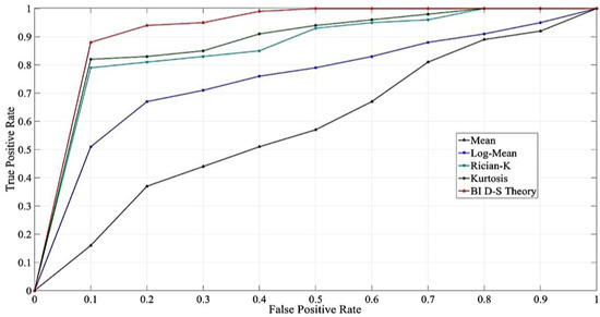 To strengthen the features of our proposed method, the performance of the various features was examined, a comparison of which is shown in Figure 7. In this field experiment, we collected 5 s of online data for each testing point, and computed four features of the online data, namely the mean, kurtosis, Rician K factor, and log mean, by using the proposed method. The true positive rate indicates that the data fell in the LOS condition and the testing results are also in the LOS condition; the false positive rate indicates that the testing results were positive but the data were not. In Figure 7, the results are shown by the data sensitivity; that is, the true positive rate versus the false positive rate. According to the results, the various features were derived with different correction rates for the LOS and NLOS judgments. The worst performing feature was the mean, followed by the log mean, Rician K factor, kurtosis, and our proposed method. In statistics, although the mean value is a useful tool, it eliminates crucial data features. Furthermore, the computations of Rician K factor and kurtosis are based on the appearance of the data, the traits of which are easy to capture. Furthermore, our proposed method is focused on the features; when one considers the time that is consumed, the proposed method outperforms the other approaches on that single feature.