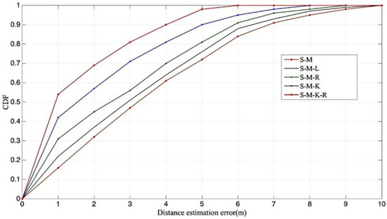 Furthermore, to compare the combinations of features, we performed experiments with different joint sets of features. Table 1 defines the joint sets of features. In this experiment, we omitted some unnoteworthy sets, and the comparison of remarkable sets is illustrated in Figure 8. Below 1 m, the estimated distance efficiency rates are accumulated from high to low; the joint feature sets are S-M-K-R, S-M-K, S-M-R, S-M-L, and S-M. The more features a calculation represents correctly, the more accurate that calculation is. The combination features with the mean, kurtosis, and Rician K achieved over 70% efficiency for LOS and NLOS recognition under 1 m.