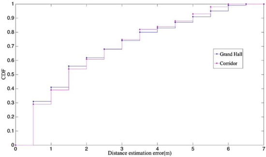 Our field experiments were conducted in two environments, one was a 30 m × 30 m grand hall, the other consisted of corridors with paths that were 40 and 30 m in length. The LOS and NLOS identification results are shown in Figure 9. According to the results, the distance estimation error of grand hall inside 3 m is slightly more accurate than that in the corridor, because the signal in the grand hall had less inflictions on the transmission in the open area. Furthermore, after 3 m, the reflections of signals were more unstable than the signal in the straight pathways, thus the accuracy level was lower in the grand hall.