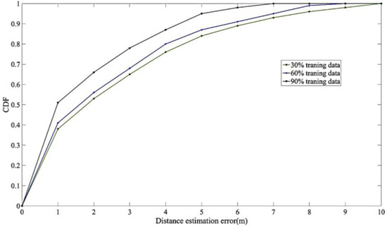 Furthermore, we tested our system on training samples of different sizes. Figure 10 shows that the system was trained on training sets that contained 30%, 60%, and 90% of the total data, and was tested on sets that contained the remaining 70%, 40%, and 10% of the data, respectively. According to the results, the average accuracy errors of the 30%, 60%, and 90% runs were 2.53, 2.47, and 2.31, respectively, and the distance estimation errors insides 1 m were 0.52, 0.54 and 0.66, respectively. The results revealed that the training sample size did not have major effects on the ability of the proposed system to identify information. However, according to the error rate under 1 m, the system with around half training data still obtain the accuracy over than 50%. Hence, the following experiment was conducted on a small training sample to conserve computational effort.