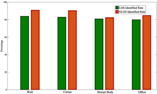 To check the robustness of the proposed method, an experiment was conducted to evaluate the signal blocking. The defilades in our second environment were walls, corners, human bodies, and iron bookshelves. To identify the LOS and NLOS signals, the experiments were performed behind the defilades, and the LOS and NLOS data were collected as in previous experiments. The final results are listed in Figure 11. According to our field tests, the degree of signal blockage does not greatly impair the accuracy of our system. The maximum and minimum average accuracies were respectively 84.3% and 80.41% for the walls and iron bookshelves. Furthermore, concrete defilades, such as walls and corners, produced obvious differences in LOS and NLOS signals.
