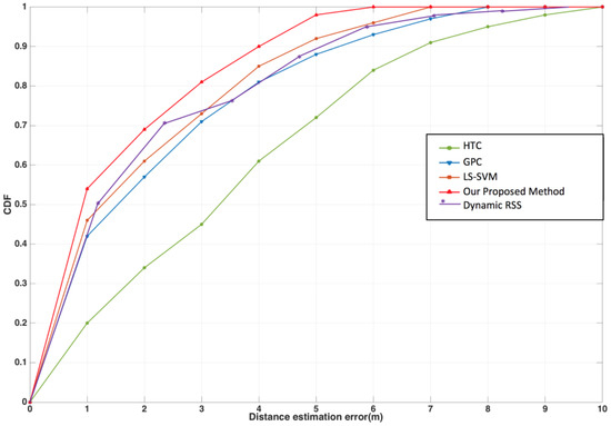 In this experiment, the accuracy levels of various machine learning methods were considered. Distance estimations for LOS and NLOS identification were conducted with Gaussian process regression (GPR), hypothesis testing regression (HTR), the least squares support vector machine (LS-SVM) methods, and the dynamic RSS fingerprint method proposed in [2], which are described as follows: