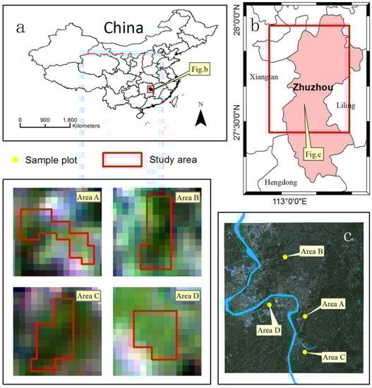 The experiment areas A, B, C, and D in Zhuzhou, Hunan Province in China and the spatial distribution of sample points.