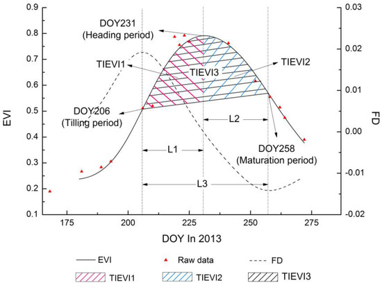where represents functions of the EVI time-series curves. TIEVI1, TIEVI 2, and TIEVI 3 equal the integral areas under the EVI time-series curves between three phenological periods (tilling period, heading period, and maturation period), respectively.
