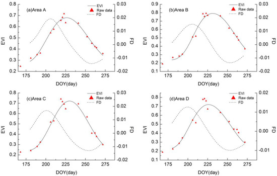 The raw data on EVI from remote sensing image, the fitting curves of EVI time-series by AG function, and their corresponding FD curves for four pixels from the four experiment areas (Area A, Area B, Area C, and Area D), respectively.