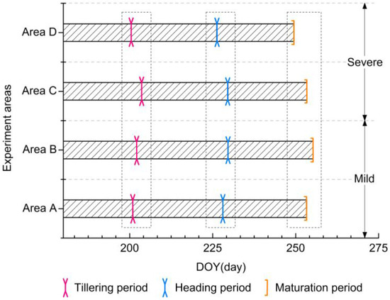 The averages of dates corresponding to the three phenological periods(the tillering period, the heading period, the maturation period) in the four experiment areas (Area A, Area B, Area C, and Area D), respectively.