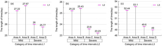 Comparison of the DOY lengths of time between three phenological periods (the tillering period, the heading period, and the maturation period): (a) L1 exhibits the time intervals between the tillering period and heading period, (b) L2 exhibits the time intervals between the heading period and maturation period, and (c) L3 exhibits the time intervals between the tillering period and maturation period, from the four experiment areas (Area A, Area B, Area C, and Area D), respectively.