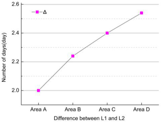 The differences () between L1 and L2 varied from the four experiment areas (Area A, Area B, Area C, and Area D), respectively.
