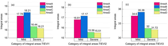 The integral areas of EVI time series during the three phenology periods (the tillering period, the heading period, the maturation period): (a) TIEVI1 exhibits the integral areas between the tillering period and heading period, (b) TIEVI2 exhibits the integral areas between the heading period and maturation period, and (c) TIEVI3 exhibits the integral areas between the tillering period and maturation period, from the four experiment areas (Area A, B, C, and D), respectively.