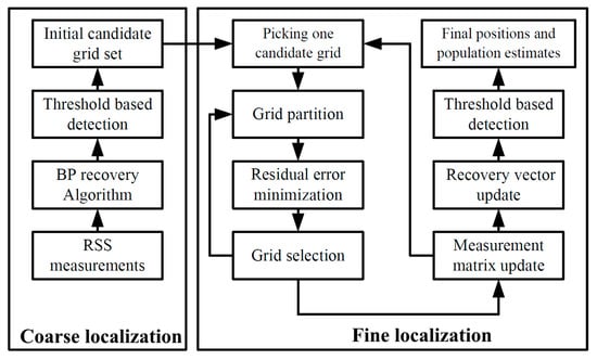 The first contribution is the improved accuracy in target population estimation. In the coarse localization phase, by determining the signal recovery vector and employing the threshold- based detection, the initial candidate target grids are determined. In the fine localization phase, based on the updated measurement matrix, the signal recovery vector is re-estimated and the identification of the target grids is performed again to reject the outliers or false target grids produced in the coarse localization phase. As a result, the target population estimation is more reliable.