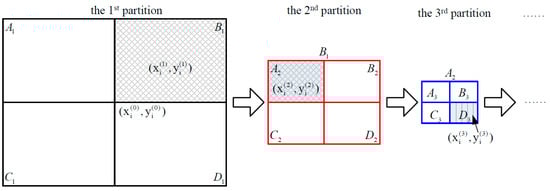 Taking an arbitrary candidate grid with the center coordinates as an example, from Figure 2, it can be seen that, at the 1st grid partition, the grid is divided into four equal-size grids A1, B1, C1, and D1. By defining the residual error as the squared difference between the measured RSS and the calculated one, the grid with the smallest residual error is selected as the target grid which is grid B1 in this case. Then, B1 is divided into four equal-size grids and the procedure continues for a pre-defined number of times. Then, the fine positioning phase is carried out in the following steps.