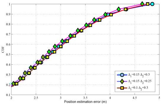 Taking SSF condition as an example, the performance under different thresholds are evaluated. The effects of the parameters such as target population and SNR can be found in the next section. Table 4 shows the target population estimation for different scenarios, when the actual target population K = 5. It can be seen that the threshold parameter and have a great effect on the target population estimation. When decreasing or in the proposed algorithm, the number of candidate grids will become larger. So the mean of target population estimation may be increased. Correspondingly, the success rate will be increased and the false alarm rate will be reduced. Figure 3 describes the success rate for different thresholds. Meanwhile, we can also see that increasing the threshold parameter will lead to an increase in the estimated target population, so the mean and the success rate are also increased. Figure 4 illustrates the CDFs with different threshold parameters, showing that the threshold parameter has a minor impact on the position estimation.