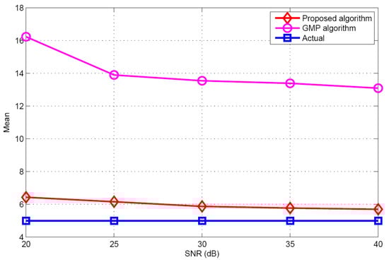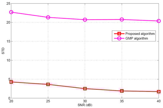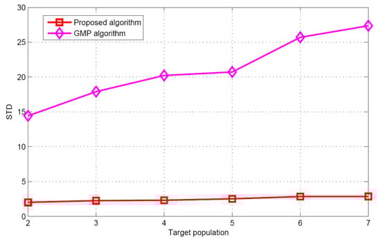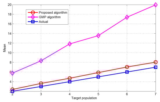 Figure 5 and Figure 6 show the performance comparison of different target population estimation algorithms. It can be seen that as the target population increases, the performance of target population estimation will reduce. Meanwhile, the mean of the proposed algorithm is closer to the actual target population than that of GMP algorithm. The standard deviation of the proposed algorithm is also smaller than that of the GMP algorithm. For the GMP approach, the process of target population estimation is terminated, only when the residual error is stationary. However, in the real environments, the measurement vector contains many measurement errors such as measurement noise, modeling error etc. These measurement errors will have great effects on the target population estimation. Therefore, according to the simulation results and theoretical analysis, it can be concluded that regarding target population estimation, the proposed algorithm is better than the GMP algorithm.