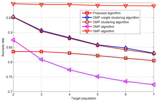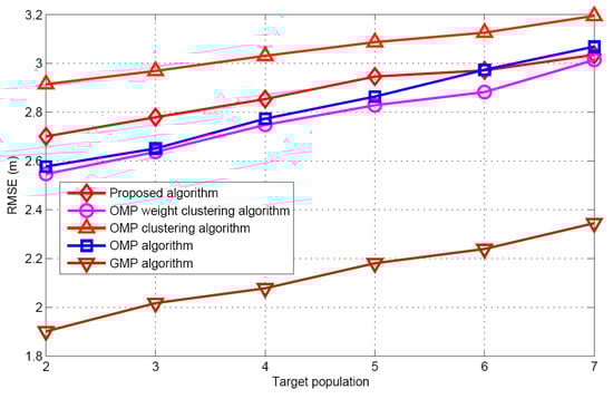Figure 7 and Figure 8 display the recovery performance comparison for K = 5 and SNR = 30 dB. As expected, the smaller the target population is, the better the recovery performance is. These results satisfy the CS theory itself. The larger target population estimation, leads to the best success rate and worst false alarm rate for the GMP algorithm. The OMP algorithm has the worst performance for success rate, because it does not consider the problem of the target position uncertainty in the grid. Although the proposed algorithm does not require any prior knowledge of the target population, it has similar performance as the OMP weight clustering approach and the OMP clustering approach, when the target population increases. Figure 9 describes the RMSE with respect to target population respectively for the five algorithms when SNR is 30 dB. Although the grid partition technique is used for the proposed algorithm and GMP algorithm. It can be seen that the performance of the GMP algorithm is much better than the proposed algorithm. The reason can be attributed that more number of target position estimation are obtained in the target population estimation.