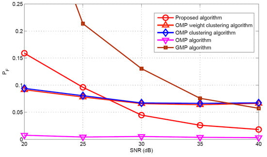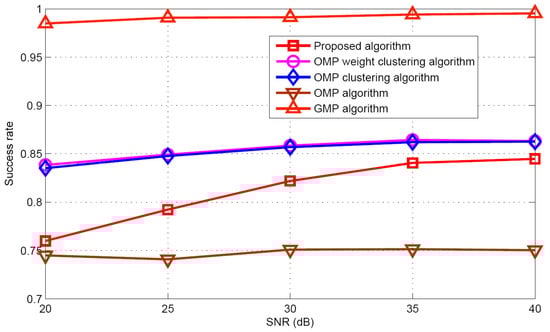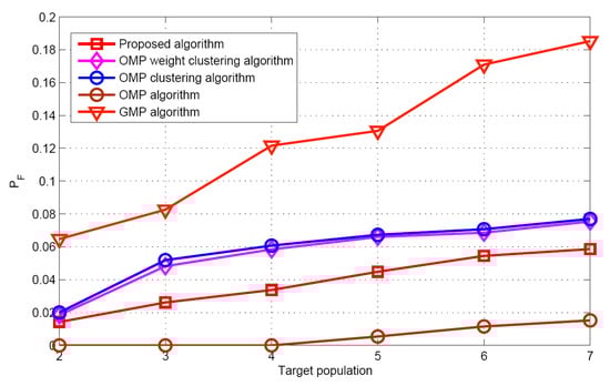 The GMP algorithm [] is used for target population estimation performance comparison. Three OMP based algorithms (OMP clustering algorithm [], the OMP weight clustering algorithm [], and the OMP algorithm []) and GMP algorithm [] are chosen for both the signal recovery estimation performance and positioning performance comparison. It should be noted that the three OMP based algorithms require that the target population K is known.