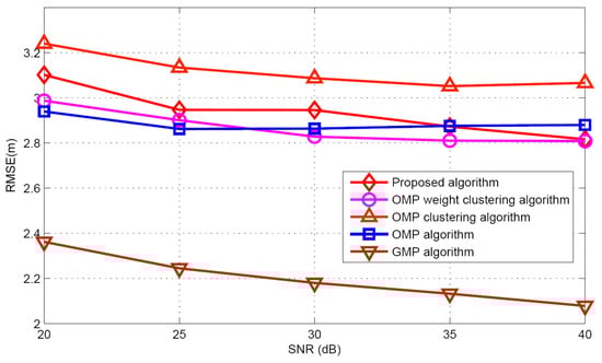Taking target population K = 5 as an example, the performances of different algorithms are compared under different SNR conditions. Figure 10 and Figure 11 illustrate the mean and standard deviation of the target population estimation. It can be seen that as the SNR increases, the performance of target population estimation is basically improved. The proposed algorithm has better target population estimation performance than the GMP algorithm. Figure 12 and Figure 13 show the success rate and the false alarm rate of different algorithms. It can be seen that the performances of the proposed algorithm and the GMP algorithm are quite sensitive to SNR, whereas the OMP- based approaches are rather insensitive to SNR. Figure 14 describes the RMSE comparison with five algorithms. It can also see that the performance of GMP approach is best and the proposed algorithm has a similar localization performance as the other three algorithms.