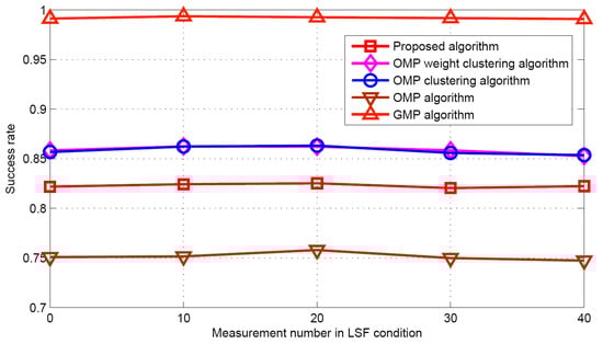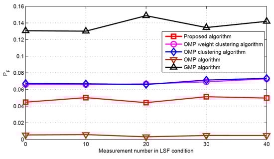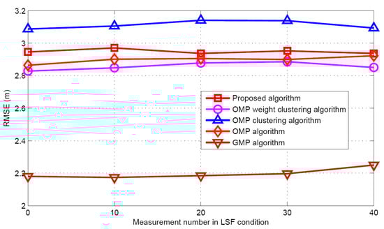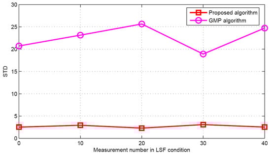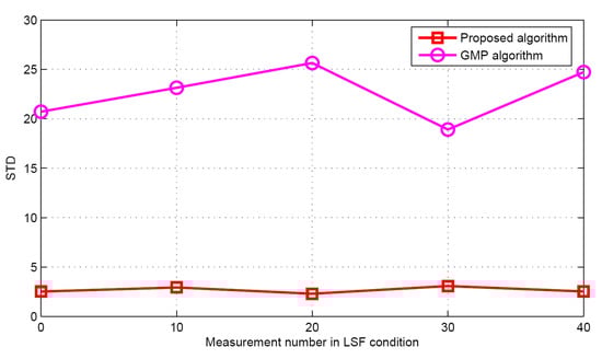 Now the performance comparisons of different algorithms are made with different measurement numbers under LSF conditions. The simulation parameters are K = 5 and SNR = 30 dB. Figure 15 and Figure 16 show the target population estimation performance (mean and standard deviation) of the proposed algorithm and the GMP algorithm. Figure 17 and Figure 18 illustrate the comparison of the success rate and that of the false alarm rate for the five algorithms, while Figure 19 displays the RMSE comparison when the measurement number in LSF condition is 25. It can be seen that same algorithm comparison conclusions can be obtained in the LSF condition. It should be noticed that since the CS technique has high recovery performance under some measurement noise conditions, all five approaches have a similar performance under different measurement numbers in LSF conditions.