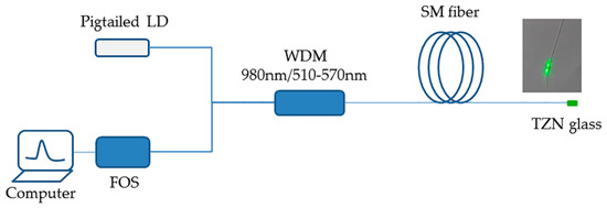 A all-fiber point temperature sensor was developed and the corresponding experimental arrangement is shown in the Figure 1. A single mode pigtailed laser diode at 976 nm was used to excite the temperature probe and its power could be regulated by a current controller. After passing through a wavelength division multiplexer (WDM, 980 nm/510–570 nm), the pumping beam enters single mode (SM) silica fiber (Corning Hi1060 specialty fiber) and subsequently excites the temperature probe. The counter-propagating green beam was detected by a miniature fiber optic spectrometer (FOS) equipped with a SONY ILX554B CCD. The temperature probe was prepared by the fiber dip coating technique. First, the surface protective layer on the tip of SM silica fiber was removed, and then the fiber tip was rapidly immersed in the molten Er3+/Yb3+ doped TZNb glasses. Thus, a thin layer of TZNb glass on the end face of the SM fiber was formed and used for temperature sensing. The temperature of fiber probe was controlled at the range of 276–363 K.