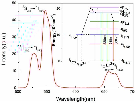 Temperature is one of the most fundamental physical parameters and accurate measurement of temperature plays an important role in industrial production and scientific research. In contrast to conventional measurement methods, as a kind of non-contact temperature measurement method, optical fiber temperature sensors have the advantages of high accuracy, dynamic response, corrosion resistance, immunity to electromagnetic fields and are suited for the temperature measurements of harsh environments (such as high current and high magnetic field, etc.) [1,2,3]. Compared with bulk sensors, the advantages of optical fiber temperature sensors are obvious. For example, the small sensor probe makes it easy to detect in a small space. The optical fiber temperature sensor based on fluorescence intensity ratio (FIR) technique was reported by H. Bertthou for the first time and had attracted great attention because of its simple structure, convenient data processing, and high sensitivity [4,5]. FIR technique is based on the large variation of the relative fluorescence intensities from two thermally-coupled levels of rare earth ions, when the environmental temperature changes. By establishing the relationship between FIR and temperature, temperature could be easily determined.