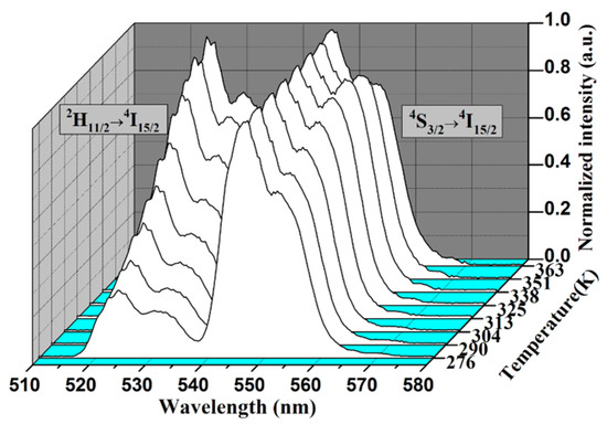 With the increase of temperature from 276 to 363 K, the relative fluorescence intensity ratio of two green upconversion emission bands changes dramatically while the peak positions do not change, as shown in the Figure 4. All the emission bands are normalized to the maximum intensity of 4S3/2→4I15/2 bands at each temperature. It is clear that the emission intensity of 2H11/2 level gradually increases, which is due to the increase of the population of 2H11/2 level at the expense of that of 4S3/2 level.