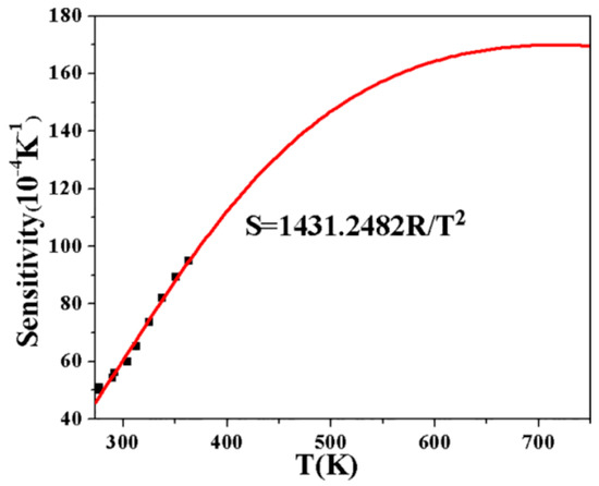 The experimental temperature sensitivity as a function of temperature is presented Figure 6. Obviously, the maximum experimental sensitivity is 95 × 10−4 K–1 at 363 K. Table 2 lists the optical temperature sensing performance in different Er3+-doped host matrices. From the comparison, the newly-developed material demonstrates the highest sensitivity and may be a promising optical temperature sensing material.
