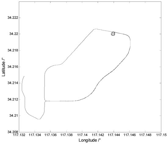 The update rate of GPS and IMU were set by 1 Hz and 100 Hz, respectively. The initial position and velocity errors are 1.0 m and 0.1 m/s, respectively. The initial position errors are set by 3.0 m, 3.0 m, 5.0 m, respectively, the initial velocity error is 0.5 m/s, and the initial alignment errors are set by 3°, 3°, 10°, respectively. Double difference GPS data were adopted with the position and velocity variances of 0.25 m2 and 0.0025 m2/s2, respectively. The precise results calculated by the double difference carrier phase were regarded as references. The motion trajectory of the land vehicle is displayed in Figure 1.