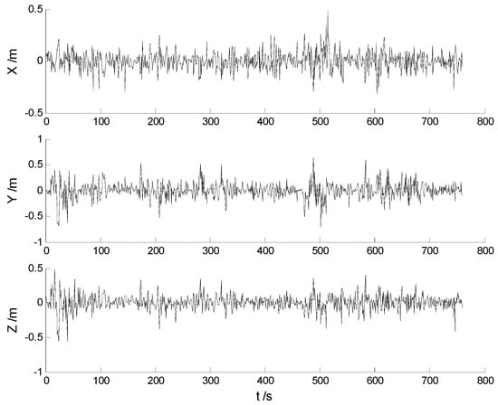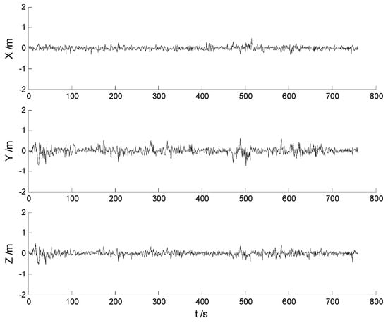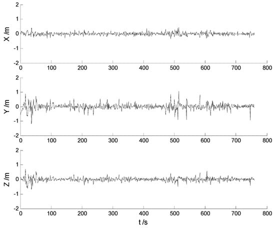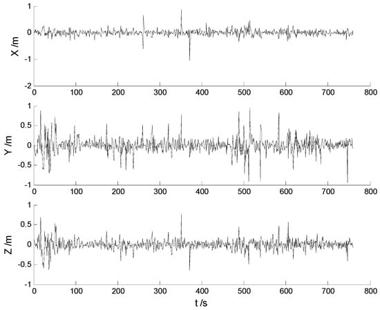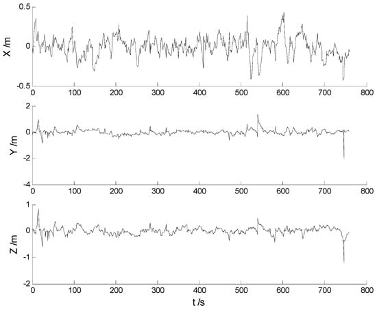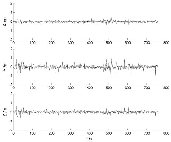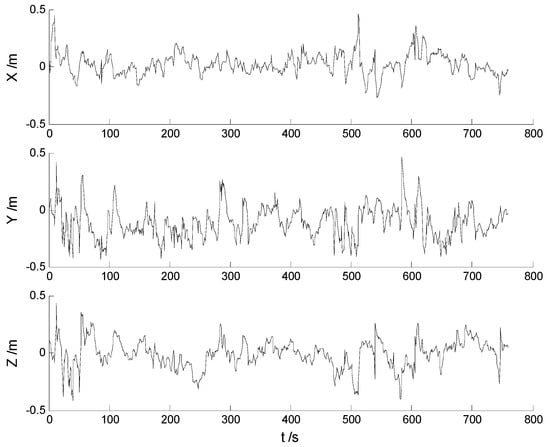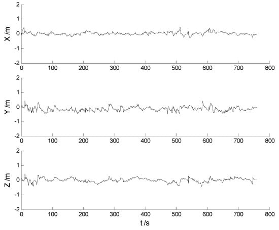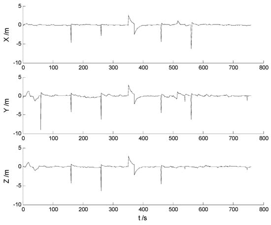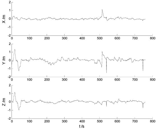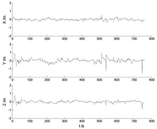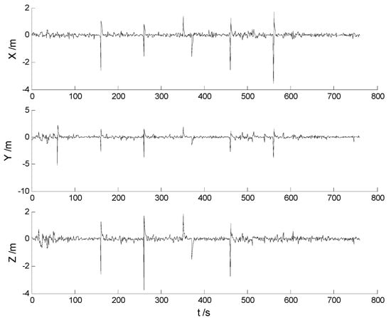 In this case, each algorithm was performed with the original measurement data. The position errors in the X, Y, Z directions of the six schemes are demonstrated in Figure 2, Figure 3, Figure 4, Figure 5, Figure 6 and Figure 7: