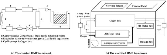 Two HMP frameworks. (a) In the classical HMP framework, the organ is saved in an isolated organ box and it uses the single compressor for temperature control; (b) In the modified HMP framework, oxygenated solution travels in the artery loop and the vein loop. Two peristaltic entrance pumps are used to promote the circular flow. Sensors are distributed in different parts for organ status monitoring.
