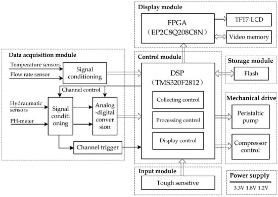 The circuit diagram of the HMP system. It contains a data acquisition module, a control module, a storage module, a mechanical drive, an input and display module, and a power supply.
