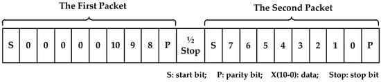 The frame format of Tsic506, (1) the first packet: 1 start bit, 3 data bits, 1 parity bit; (2) the second packet: 1 start bit, 8 data bits, 1 parity bit; (3) between the first packet and the second packet: 1/2 stop bit.