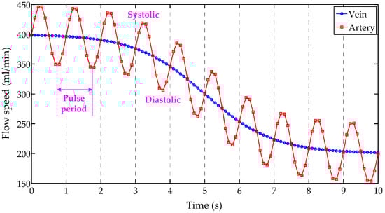 An example of two drive models, (1) vein model: a smooth curve from 400 mL/min to 200 mL/min; (2) artery model: a fluctuating curve from 400 mL/min to 200 mL/min. The peak of artery model reflects the flow speed when the blood is systolic, while the valley reflects the flow speed when the blood is diastolic. Its fluctuating period equals to the heart pulse period.