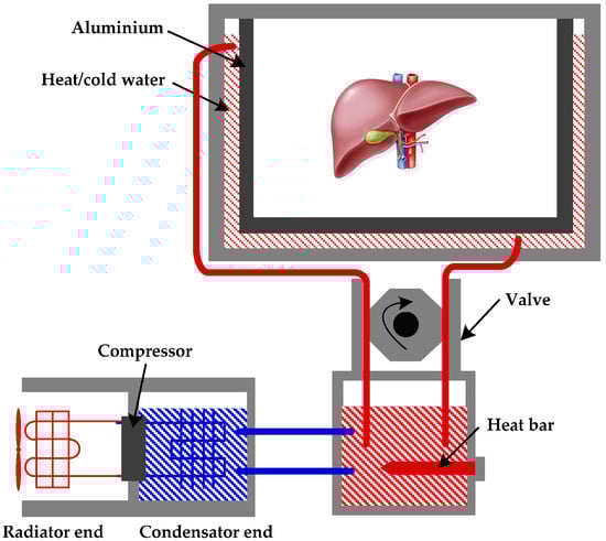 The thermostatic control equipment, i.e., a compressor and a heat bar, are controlled by DSP to increase and reduce the temperature of water, respectively. After a controllable valve, the water can reach the thin aluminium alloy around the stored organ. After that, the heat of water can penetrate the metallic material and adjust the organ temperature.