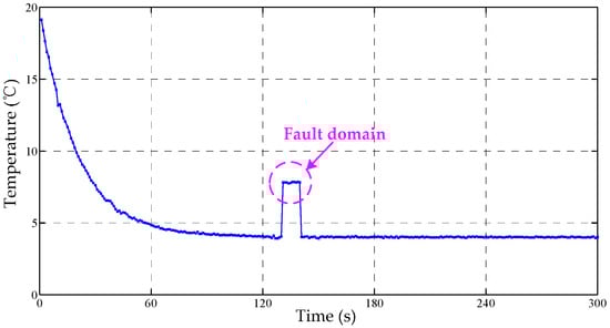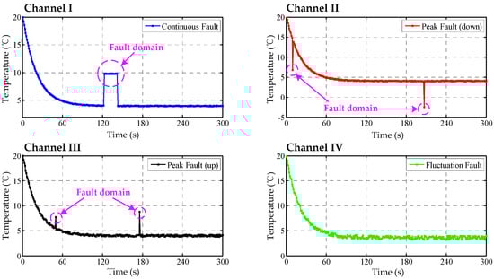 The data curves of TSic506 units, channel I: continuous fault resulting from sensor fault; channel II: down peak fault resulting from accidental fault; channel III: up peak fault resulting from accidental fault; channel IV: fluctuation fault resulting from interfering noise.