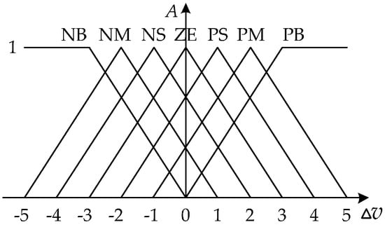 The schematic diagram of fuzzy control. Here ∆u is the control quantity; ∆v is the motor speed; cv = dv⁄dt is the change rate of speed; K1 & K2 are the quantification factors; K3 is the scale factor. Where ∆u, ∆v, ∆cv are three domains of discourse of fuzzy controller.