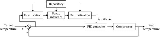 The flow diagram of fuzzy-PID method. Here three parameters , and are adjusted using the fuzzy controller, then they are set as the proportion, integral and derivative coefficients of the PID controller.