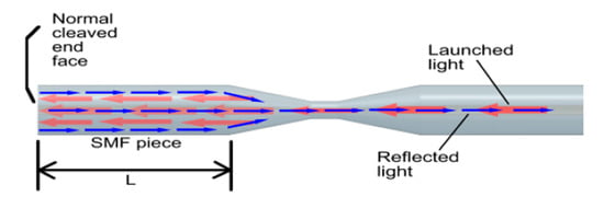 The structure of the proposed OFMI and the light modes propagation through the device are shown in Figure 1. An optical fiber taper spliced to an SMF segment with length L comprise the sensing device. The light that is launched to the core fiber at the input is propagated through the tapered fiber (left pointing red arrows). In the taper position, the fundamental mode of the core fiber couples part of its energy to cladding modes. Then, both modes from the core and cladding travel through the SMF segment. In the normal cleaved end face of the SMF, the ~4% energy modes are reflected by Fresnel reflection (right pointing blue arrows) and propagate in opposite directions through the taper, where the cladding mode recouples part of the energy to the core mode.