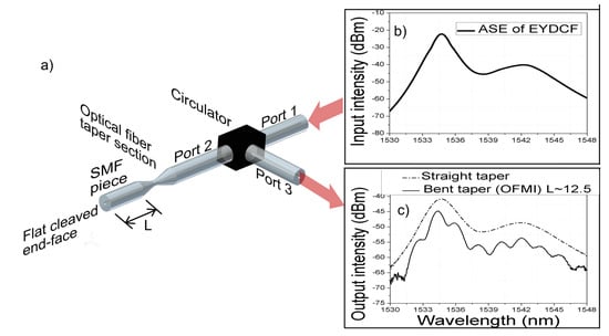 The tapered optical fiber is adiabatic and has a bi-conical shape with transition lengths of 2.5 mm, a waist length of 1 mm, and a waist diameter of 60 µm. The fiber was tapered with the mentioned dimensions by using a glass processing machine Vytran model GPX-3400 manufactured by Vytran LLC at Morganville, NJ, USA. As the dimensions of a bi-conical fused taper are essential to its functioning as an interferometric device [18], the taper dimensions were selected in order to have a taper that is adiabatic, yet at the limit in which the taper gradually loses its adiabaticity by a slight deformation such as bending. Considering other taper dimensions, such as waist size, waist length, and transitions length, will result in differences in the adiabaticity and spectral properties of the OFMI. Using a fiber circulator, the reflected output spectrum of the OFMI from the amplified spontaneous emission (ASE) of an Erbium-Ytterbium double cladding fiber (EYDCF) was measured by an Optical Spectrum Analyzer (OSA) with a resolution of 0.07 nm, as seen in Figure 2. The spectra of the ASE input signal and the reflected output signal of the OFMI when the mode coupler is straight and when it is bent to a radius of ~48,208.75 mm is also shown in Figure 2. As can be observed, while the tapered optical fiber is fixed in a straight position, the output spectrum is just the ASE reflected light from the SMF segment, since the taper is not performing as a mode coupler until it is perturbed by bending.
