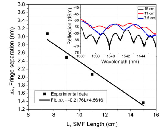 where Δλ denotes the wavelength fringe separation as a function of the length of the SMF piece. For the proposed OFMI-based sensor, the SMF length range varied from 7.5 to 15 cm, where the data can be approximated to a linear fit maximum slope value of around −0.2176 nm/cm. The inset in Figure 3 shows the measured reflected interference pattern spectra for the bent OFMI with 15, 11, and 7.5 cm of L when they are bent to a curvature radius ~48,208 mm.