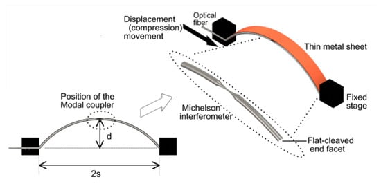 The schematic of the stage used to characterize the OFMI by mechanical displacement or bending is shown in Figure 4. The OFMI was mounted in a fabricated V groove in a flexible metal sheet ensuring that the bi-conical taper was positioned in the middle of the sheet whose total length was 29.1 cm. The OFMI was glued only on one metal sheet end to avoid the fiber being longitudinally stressed when bending and prevent the fiber from breaking. The metal sheet was compressed by the axial displacement of a micrometric linear translation stage. The corresponding bending for every displacement position was calculated by using the formula [12]: