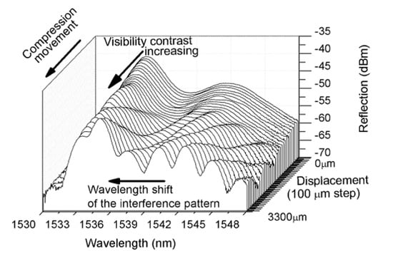 When the sensor is used to measure the displacement related to bending, the spectral wavelength shift sensor response can be adjusted by varying the length of an SMF, which can be done by simply cutting or splicing standard fiber. Also, the spectral shape response of the sensor can be modified by changing the SMF length, and the sensor interrogation can be done by either wavelength shift or spectral visibility change. These characteristics are very useful to adapt the sensor to special conditions for a particular measurement application.