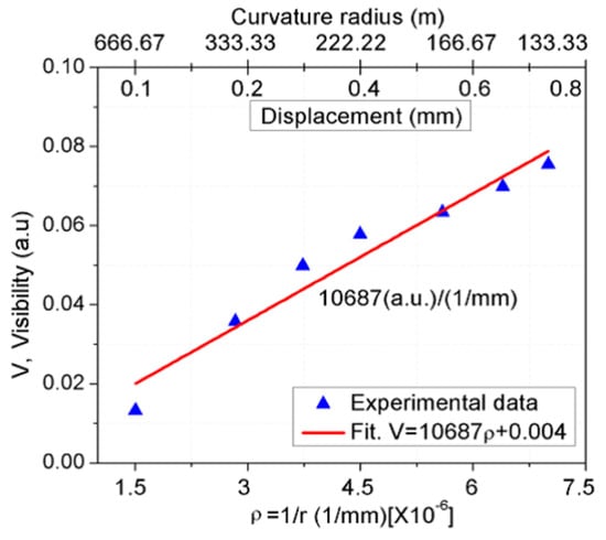 When the linear translation stage compresses the metal sheet, the device is bent and its curvature radius decreases. As a result, the spectral response of the OFMI shifts toward shorter wavelengths and a small visibility increase is also caused in the interference pattern of the spectrum, as can be observed in Figure 5, from zero displacement to 3300 µm of a device with ~10 cm of SMF length, which are the straight position and a curvature radius of 55,448.53 mm, respectively. In Figure 5, the upper curve is the measurement output spectrum when the device is straight, i.e., without modal interference. As the displacement is applied, the device is bent, modal interference takes place, and the fringe contrast of the notches in the interference pattern increases as the displacement increases while a wavelength shift is also caused. Figure 6 shows the spectral visibility sensor response for a device with 7.5 mm of SMF segment length. An increase in visibility was observed as the inverse curvature radius (ρ) increases from 1.5 × 10−6 to 7 × 10−6 mm−1 with an approximate linear factor of around 10,687 (a.u.)/(1/mm). Different sensor lengths were tested and they show similar visibility increase.